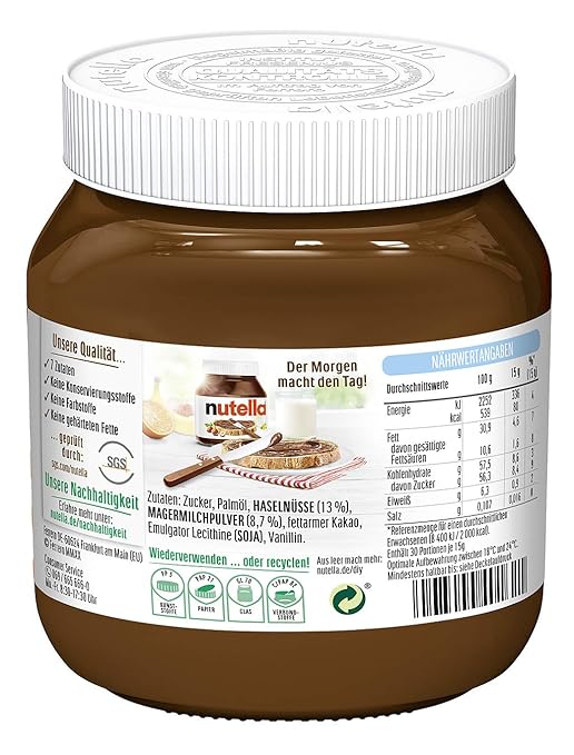 Es gelten für jede Einheit .leckerer Brotaufstrich.Feiner Nuss-Nugat-Creme.Ideal zum Frühstück.Liebe, Leidenschaft, Einsatz und große Sorgfalt sind Zutaten, die du stets in jedem nutella-Glas finden wirst.Sorgfältig ausgewählte Zutaten